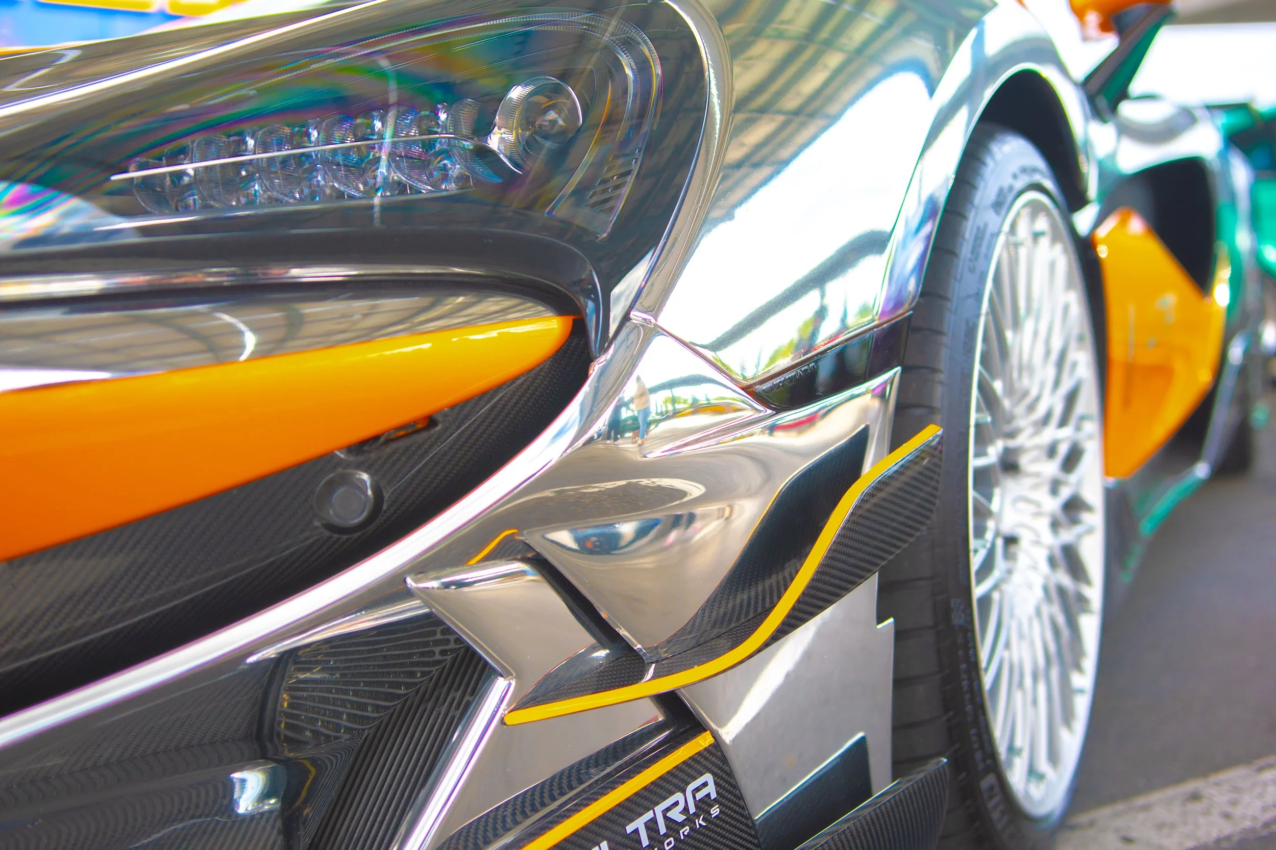 Amoung the prides of lions and seas of supercars, this McLaren caught my eye. One of the only cars I noticed that seemed to be just as colorful as the dancing lions. This chrome and orange car is owned by the Paint Protection Company (PPF) called Ultra Autoworks.